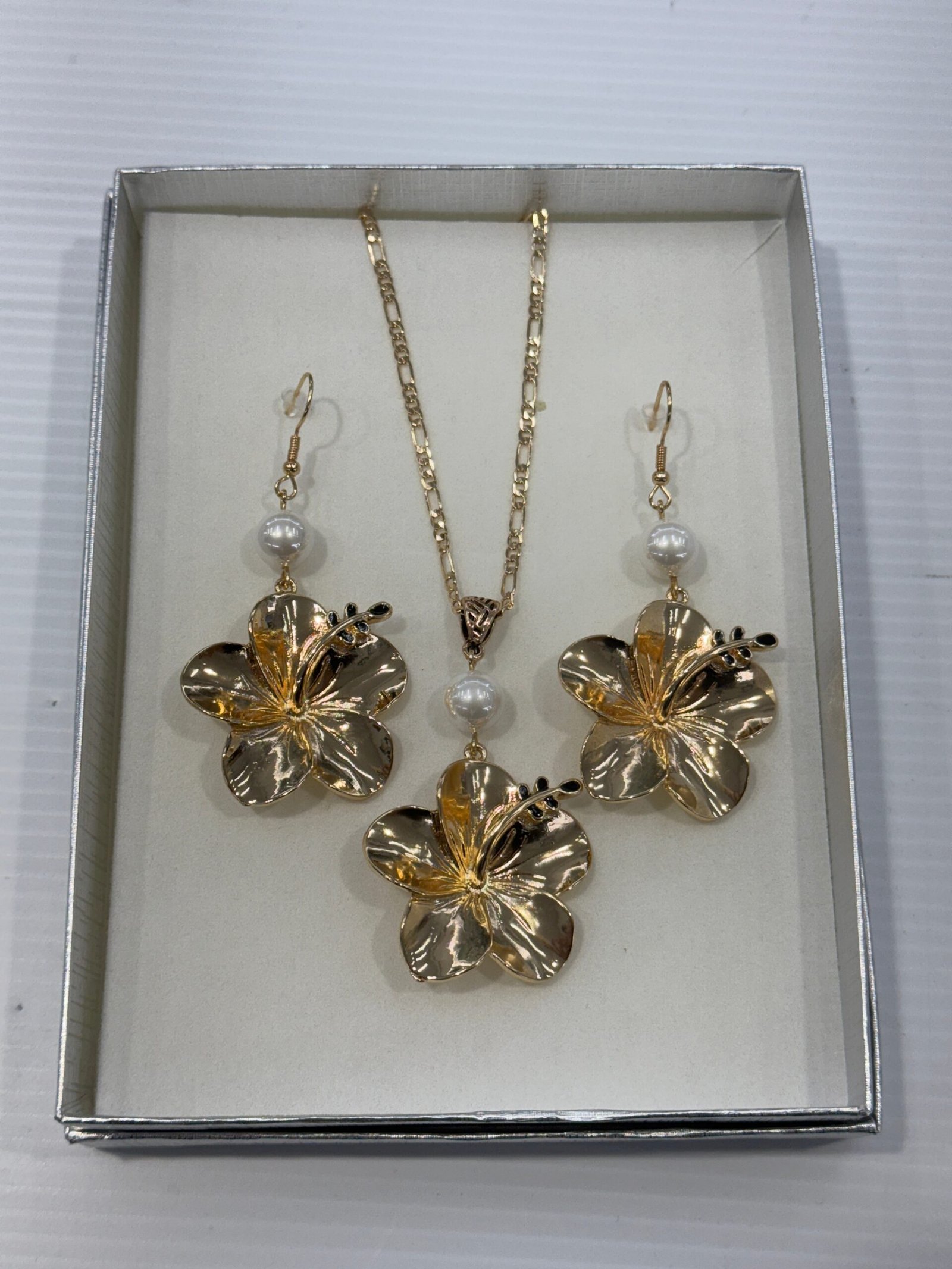 Flower Pearl Jewellery Set White/Gold 60cm Chain